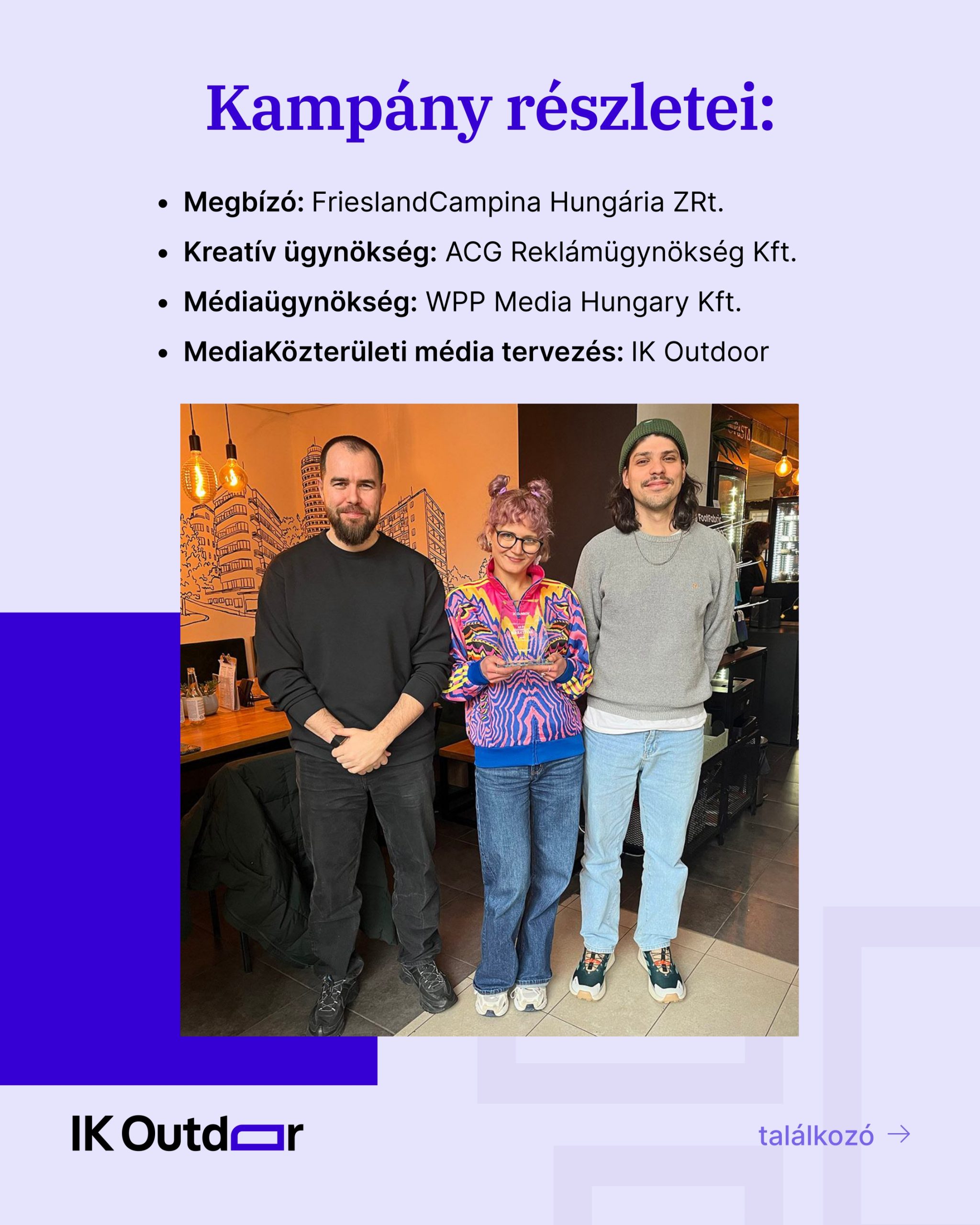 A megbízó a FrieslandCampina, a kreatív ügynökség az ACG, a médiaügynökség a WPP Media volt. A közterületi média tervezést pedig mi, az IK Outdoor végeztük.